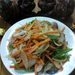 2.Cut onions, carrots, pork and green pepper into thin strips