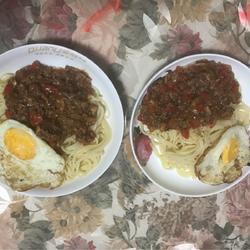 9. Finally, heat the pot and pour cold boiling water over it.Pour the meat sauce, put the eggs, and add some Korean chili sauce if you want it spicy