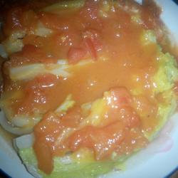 3. Wash the tomatoes and dice them.Put a little oil in the pot and heat the oil.Finally, add tomatoes and stir-fry to make juice.This is done by squeezing the tomatoes to make a sauce.Add a small amount of Flavor and salt, stir evenly, add a little water starch, and simmer until thickened