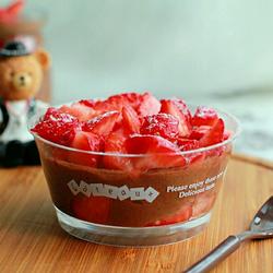 4. Cut the strawberries into small dices, spread them on the bottom of the container, and squeeze on the chocolate mousse.Now, spread another layer of diced strawberries and sprinkle with powdered sugar.
