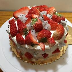 17. Take the remaining cream and smooth it on the surface of the cake.Decorate with strawberries and some diced dragon fruit