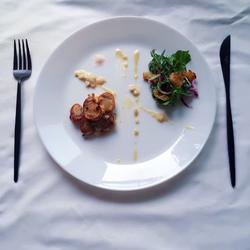 Recipe for pan-fried scallops with garlic sauce and Caesar salad