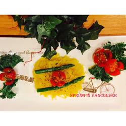9. As for the presentation, everyone likes it.I use a rectangular pot.Cut cherry tomatoes to make fruit flowers.First arrange the kale green leaves on the bottom of the plate and place the holy fruit on top.Place pumpkin shreds in the center of the plate, then asparagus and cherry tomatoes.A plate of vegetable noodles is complete.
