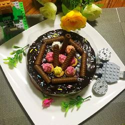 13. Melt the remaining dark chocolate over water , let cool slightly and pour it on the mousse cake, then put decorated biscuits (or fruits) and sprinkle with colored chocolate for decoration