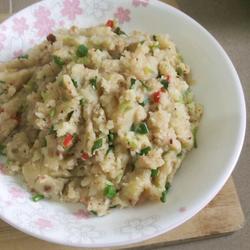2.Crush the potatoes and add appropriate amounts.Stir sesame oil, salt and chicken essence.
