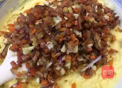 5.Onions, carrots, egg whites, ham all Cut into small cubes, add butter to the pan, stir-fry all the ingredients, add a small amount of salt and appropriate amount of black pepper (you can add more)