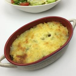 4. Press the steamed potato slices into a puree, add salt to taste and stir , put the prepared mashed potatoes in a layer on the baking pan!