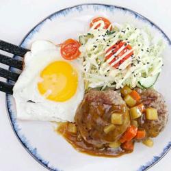 6. Put the cabbage on the salad dressing, sprinkle some black sesame seeds, fry a poached egg and put it next to the salad, put the beef burger next to the salad, pour it with curry sauce Serve.