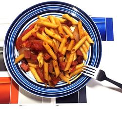 In another pan, add the garlic and stir-fry until fragrant, pour a spoonful of tomato sauce, add the onions and stir-fry.When the onions are soft, add the tomatoes and ham, and finally add the noodles, stir-fry evenly and serve!