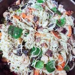 1.Soak black fungus for two hours in advance.After about a while, soak the pasta in cold water until soft.(You can also put it directly into the boiling pot, but it will take a little longer to cook).At this time, dice the bacon, onions, carrots, and green peppers and set aside