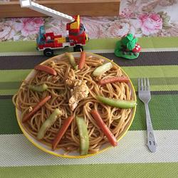 8.When almost done, put in the cold water spaghetti, add soy sauce, sesame oil, and stir-fry p>