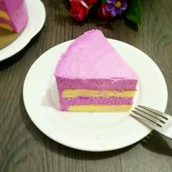 6.Take a six-inch cake mold and lay it with a piece of chiffon cake.Pour in half of the mousse liquid.Shake it so that the mousse liquid completely covers the cake piece, and then spread it on top.A piece of cake