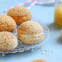 15. Cut the top of the puff and fill it with cream.You can also pipe it in from the bottom of the puff using a piping tip.The cream is filled before eating the puffs.If you fill the cream too early, the puffs will become soft after absorbing water, and the pastry will not be crispy.
