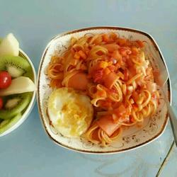 5. After the tomato sauce is fried, add the pasta and stir-fry.A delicious breakfast is ready!
