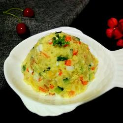 3.Cut cucumber, carrot, ham, and egg white into cubes, and press the egg yolk into puree