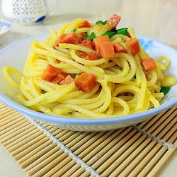 1.After the pasta is cooked, remember not to put it in cold water.Take it out directly to remove the water and mix with oil.2.Use medium heat to stir-fry meat and ham.Turn down heat to low when adding curry.3.You can also replace the pork with beef and mix it according to your personal taste.