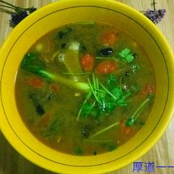 7. Add 500 grams of fresh soup, salt, chicken essence, light soy sauce and pepper Season with powder and aged vinegar, then add fungus, crispy pork, and a few green vegetables, bring to a boil for two minutes and turn off the heat.
