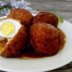 5. Wrap the mixed meat filling outside the eggs and roll it into a ball shape.Make four meatballs in sequence.