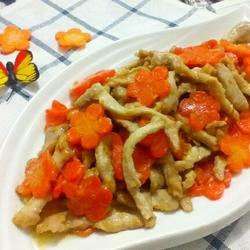 1. Peel, wash and slice the carrots, press them into flower shapes with a mold, cut the tenderloin into shreds, and shred the onions and ginger