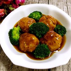 10. Thicken the remaining soup with water starch and pour it over the meatballs.Place on a plate and surround the meatballs with the blanched broccoli.