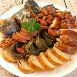 12.It is best to let the crispy pot cool down.It is best eaten with aspic jelly.When eating, put the lotus root and beans Cut the skin rolls and kelp rolls into slices, slice the meat, and put them on the plate.
