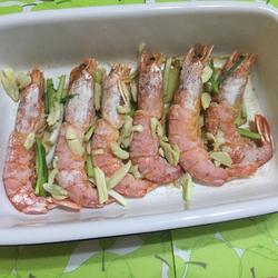 5.Peel the garlic, peel it and sprinkle it on top of the shrimp