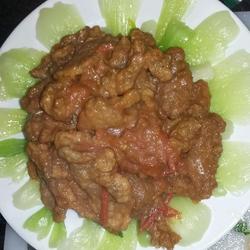 4.Pour small crispy pork into the sauce, stir-fry, stir well, and serve Blanched rapeseed dish.
