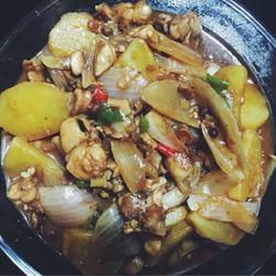 7.Add two onions and potatoes, stir-fry, add pepper, two spoons of bean paste, stir-fry, and simmer over medium heat