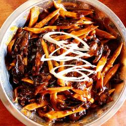 5. Heat oil in a pan until it is 80% hot, add shiitake mushroom strips and fry until brown , remove and drain.