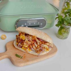 10.Put the fried onions and shredded chicken breast into the ciabatta bread