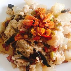 7.Down Add the radish, soaked rice, and goldenrod, then add a small amount of salt and light soy sauce to season and color.