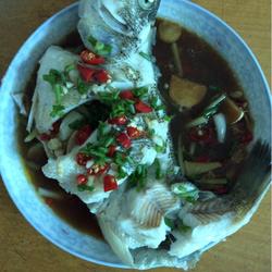 2.Cut the peppers, ginger, and garlic and lay them on top.Cut the scallions into sections, separate the white and green scallions, and stuff the white scallions.Put it into the belly of the fish and sprinkle an appropriate amount of salt and chicken essence