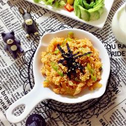 7. Finally, take it out of the pan and put it on the plate, sprinkle with cooked sesame seeds and roasted seaweed shreds.It’s time to eat!