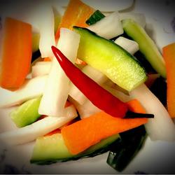 2.This time I cut the cucumbers, radish and carrots into strips about the size of my index finger.I personally feel that the strips taste better.You can also slice them into cubes if you like.