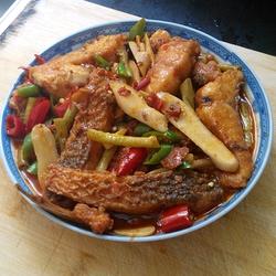3. Slice garlic, cut raw pepper into small sections, cut kimchi, and soak ginger Slice the pickles into long sections.Add oil to the pot, add garlic, dried chili pepper and Pixian bean paste until fragrant, then add a bowl of water.After the water boils, put the previously cut side vegetables into the pot, and then throw the fried fish pieces into the pot together.Cover the pot and cook for about 2 minutes before serving.Be careful not to boil the water dry~