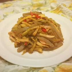 I bought an older konjac tofu, which is very elastic.This kind of older konjac tofu does not need to be boiled in boiling water in advance.Old konjac The alkaline smell is relatively strong.Friends who are not used to it can soak it in water for a while first.Be sure to add salt after putting the konjac in the pot, otherwise if you add the kimchi after it is put in the pot, the kimchi will be very salty.Chop the pepper to adjust the spiciness and add the amount according to your personal taste.Finally, stir-fry over high heat.Do not stir-fry for too long, and do not add water.The konjac tofu will release the water on its own