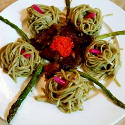 Steak ( Three pieces ) | Japanese green tea noodles for four ( 250g ) |