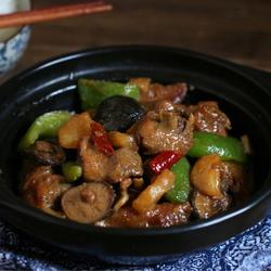 6. Push the chicken pieces to the side of the pot.Stir the ginger slices, garlic slices, and dried red pepper over low heat until fragrant.Then stir-fry with chicken pieces.Pour in two tablespoons of light soy sauce and one tablespoon of soybean paste and mix well.