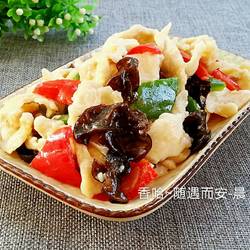 4. Soak the fungus in clean water., wash; wash and slice green and red peppers; cut onions, ginger and garlic into patterns