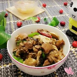 5. After the pressure cooker trips, pour the chicken pieces into a wok or casserole.After boiling Add enoki mushrooms and cook for two minutes, add green peppers, and then add lettuce and prepare to cook!
