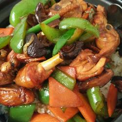3. Blanch the chicken legs until they are dry and turn them over.Stir-fry until cooked, add bell peppers, carrots and mushrooms, stir-fry, add seasonings and simmer until cooked.