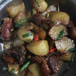 5.After 40 minutes, add the radish and simmer for another 30 minutes, and finally add the green onion together.Red pepper, garlic, rock sugar, salt, reduce the juice over high heat and serve on a plate
