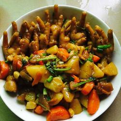 5. When the potatoes and carrots are almost cooked, pour the chicken feet into the pot and stir-fry until cooked through, add salt , soy sauce, a little water, cooking wine, oyster sauce, a little sugar seasoning