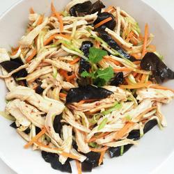 6. Add vinegar, soy sauce, sugar and salt to the shredded chicken, carrots, cucumbers and fungus , chicken essence and fried cooked oil, garnished with mint.