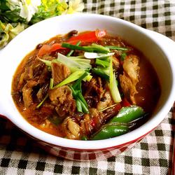 5. Oil heat Heat the pot over low heat.Add ginger and green onion.When fragrant, add beef and stir-fry.