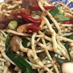 11. Add the white garlic and stir-fry until fragrant, then add the root of the folded ear and stir-fry.Pay attention to these (move slightly quickly) otherwise the white garlic will become fragrant and the white garlic will also become fragrant.It's old, and the root of the ear is the same, which affects the taste.You can also use long sections of shallots.I didn't buy shallots at home, so I used garlic