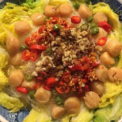 4.Fans Soak in cold water until soft and spread a layer on the bottom of the plate.Boil the water in the pot plus the water used to soak the scallops before.Add an appropriate amount of salt and cooking oil, add the chopped baby cabbage, blanch it for about a minute, take it out and put it on top of the vermicelli, and place the other part of the vermicelli on top of the baby cabbage.Add the soaked scallops, pour in the garlic sauce prepared in the previous step, add an appropriate amount of pickled peppers, add the water to the steamer after boiling, and steam over high heat for 13 minutes