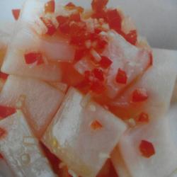 1. Wash and peel the white radish, cut into pieces, marinate with refined salt for 2 hours, then rinse the salt with water, dice the red pepper and pat the garlic broken.