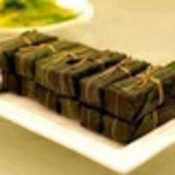Use washed and dried galangal leaves to The formed glutinous rice balls are tied up one after another, and then they can all be put into a large wooden steamer and steamed over fire.