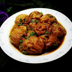 6.Poke a piece of fried gluten with your finger, turn your finger a few times in the middle of the gluten to free up There is plenty of space for the meat filling